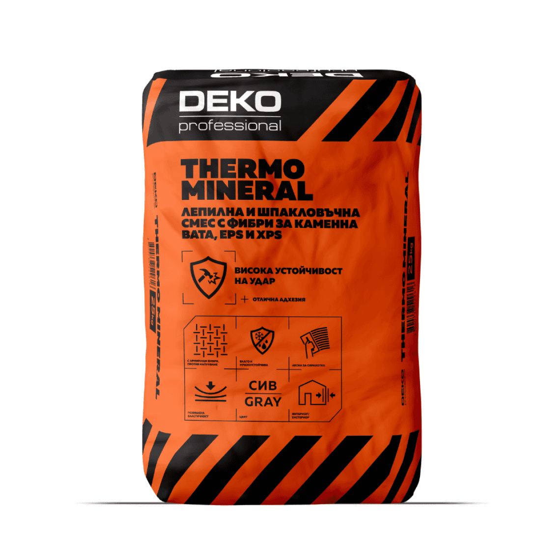 Deko professional Thermo Mineral е суха лепилна и шпакловъчна смес, предназначена за лепене и шпакловане на топлоизолационни плоскости от каменна вата, EPS и XPS. Формулата с фибри повишава устойчивостта и еластичността на системата, като същевременно осигурява отлично сцепление с различни минерални основи.